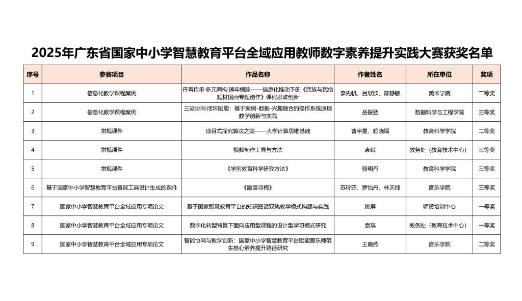 根據(jù)《關(guān)于2025年廣東省國家中小學(xué)智慧教育平臺全域應(yīng)用教師數(shù)字素養(yǎng)提升實踐大賽獲獎名單及報送全國交流名單的公示》,我校教師在此次大賽中表現(xiàn)優(yōu)異,共獲9項榮譽,其中一等獎2項、二等獎3項、三等獎4項,涵蓋課程案例、常規(guī)課件、專項論文等多個項目。本次大賽以“人工智能賦能高質(zhì)量課堂”為主題,旨在全面落實國家教育數(shù)字化戰(zhàn)略行動,推動教師數(shù)字素養(yǎng)提升與教育教學(xué)創(chuàng)新。自2025年4月大賽啟動以來,我校高度重視,由教務(wù)...